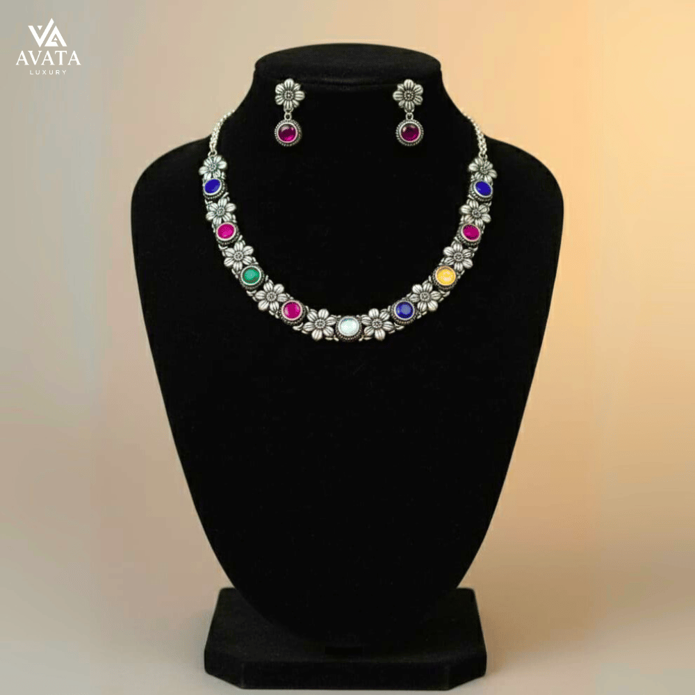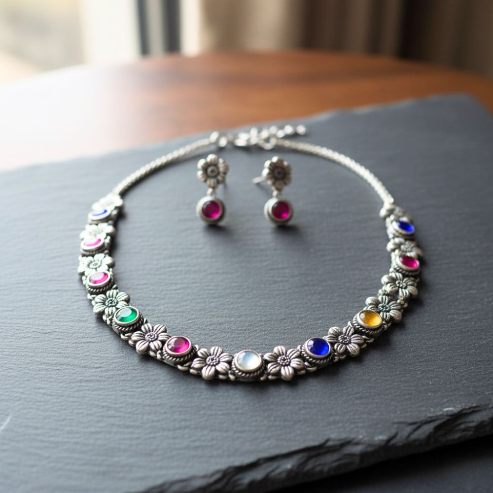 Add a vibrant charm to your look with this exquisite necklace set with matching earrings, crafted in durable brass base metal and finished with a striking antique silver polish. Designed with intricate floral patterns and adorned with multi-colored stones including red, blue, green, yellow, and white, this jewelry set beautifully blends tradition with modern elegance. Perfect for festive celebrations, weddings, or special occasions, it enhances both ethnic and Indo-western outfits.