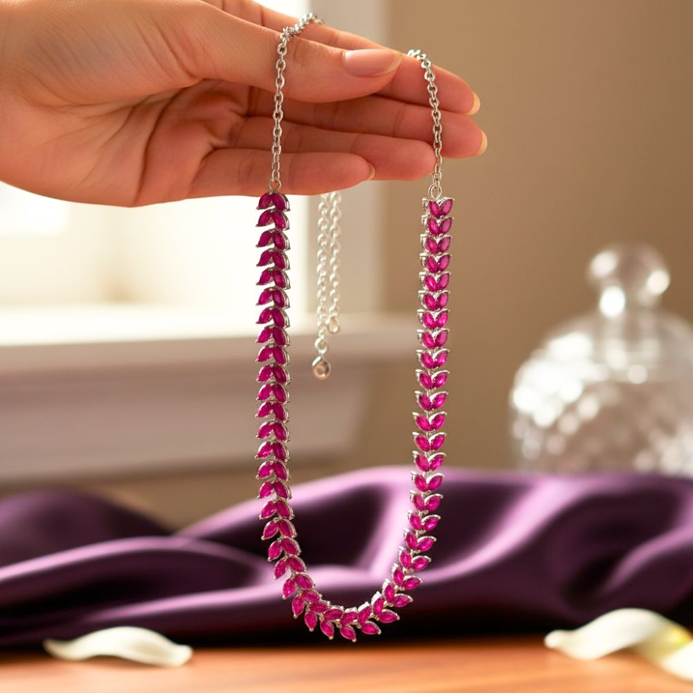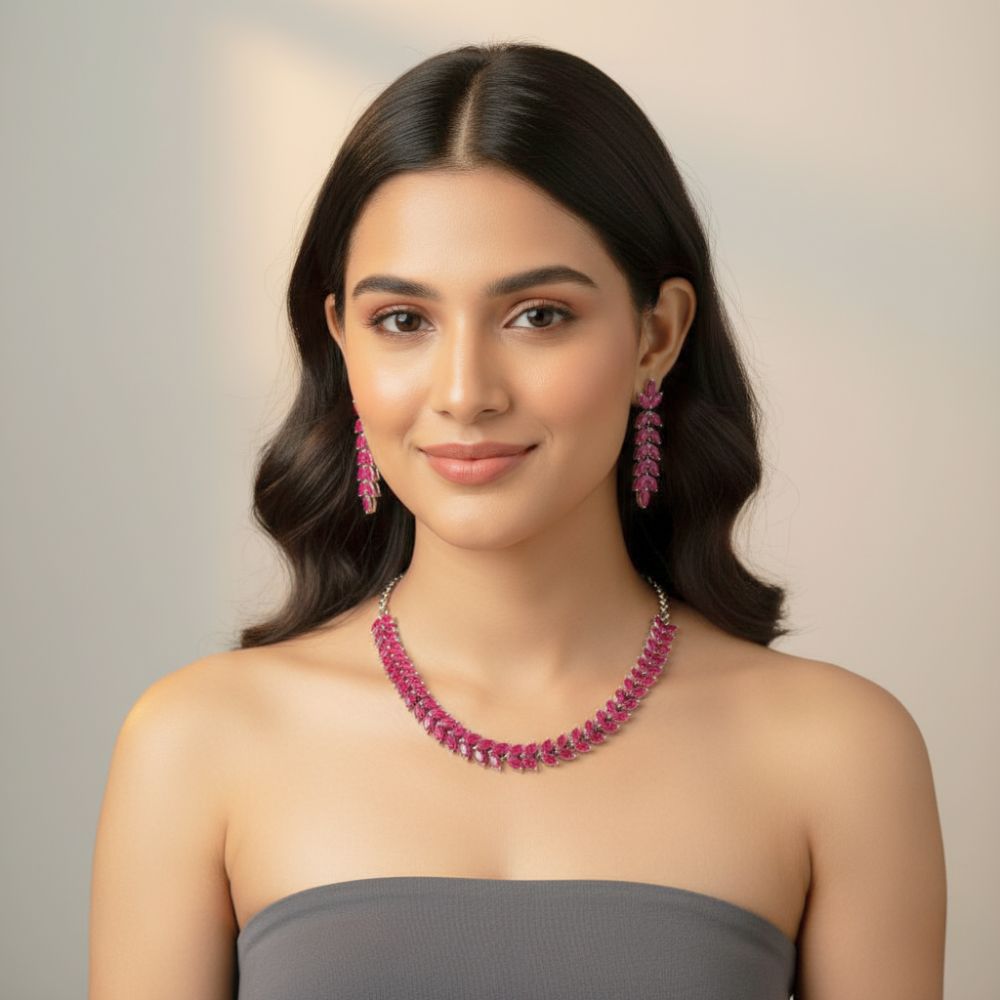 Enhance your look with this beautifully crafted imitation jewelry set, featuring a stunning necklace and matching earrings. Made from high-quality brass with a durable silver antique polish, this jewelry set is designed to give you a luxurious yet affordable style statement. The elegant leaf-patterned design with vibrant pink stones adds a touch of sophistication, making it perfect for weddings, parties, festive occasions, or everyday wear.