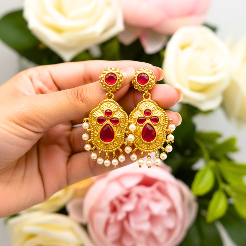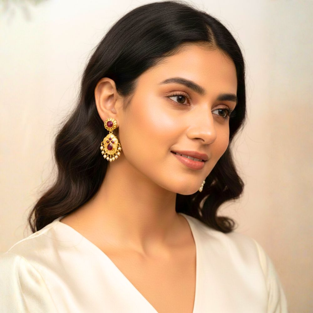 Gold Plated Ruby Red Stone Traditional Earrings with Pearl Drops