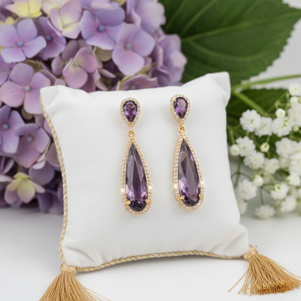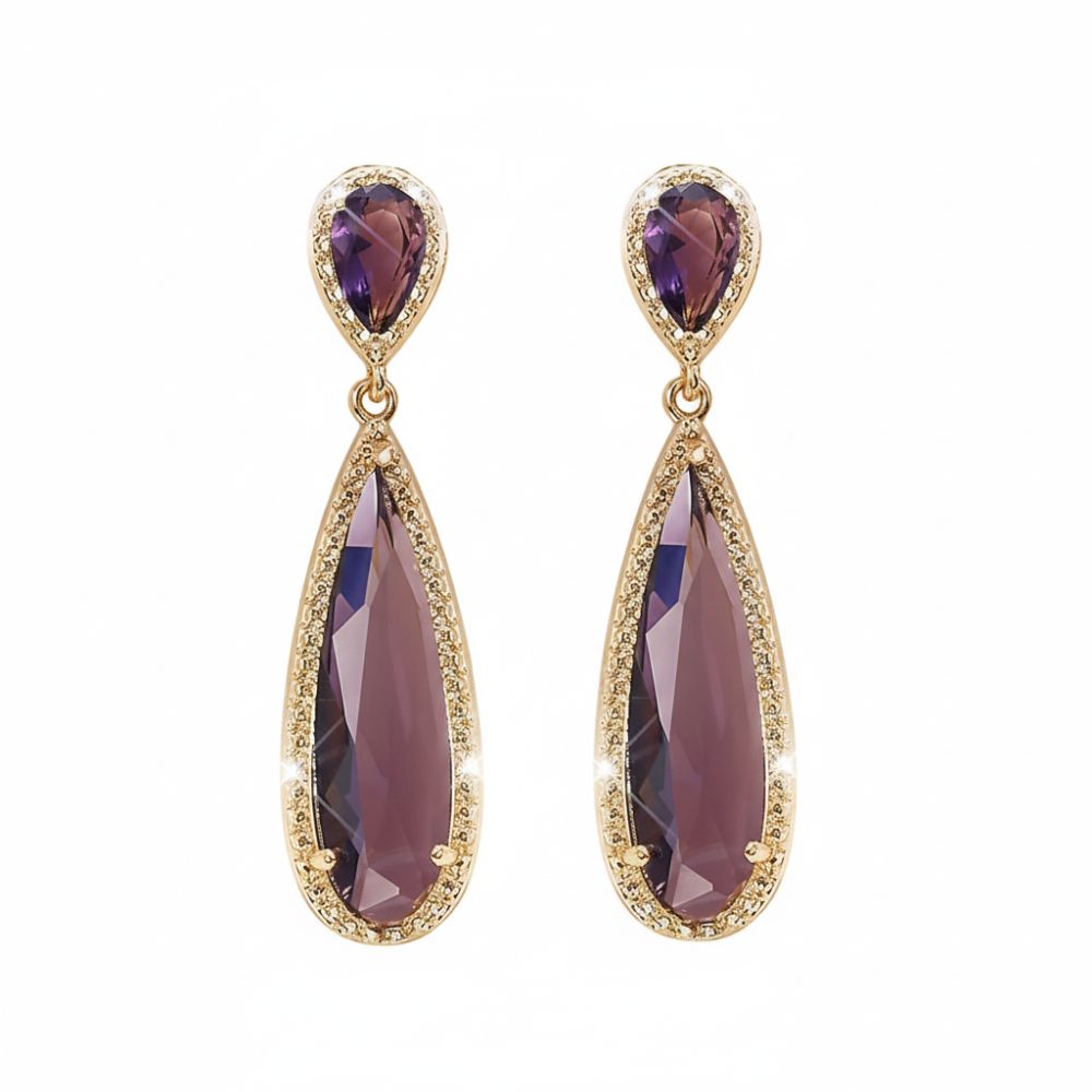 purple teardrop earrings, crystal drop earrings, gold plated earrings, long earrings for women, luxury jewelry, wedding earrings, party wear earrings, elegant statement earrings