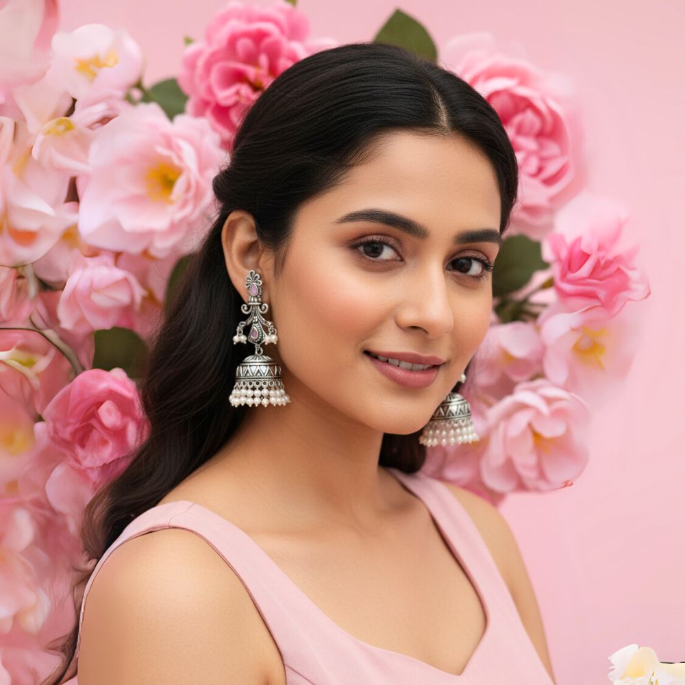 - Jhumka Bell: The classic bell (Jhumka) features distinct tribal or patterned engraving around the rim, contributing to the rich oxidized silver finish.